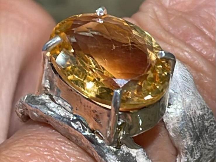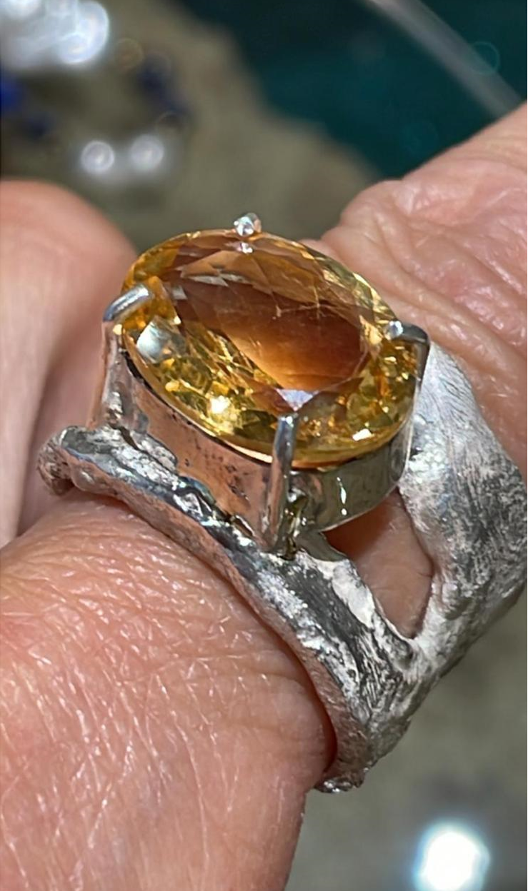 Anello in argento 800, lavorato a mano e regolabile. Con pietra in quarzo citrino.